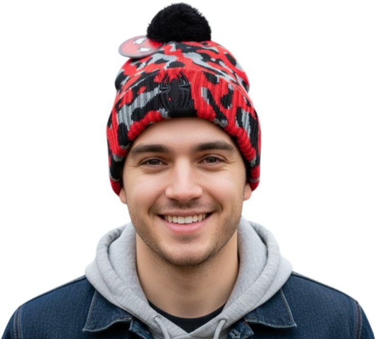 The Concept One Marvel Spider-Man Youth/Adult Cuff Beanie Hat with Pom Pom in one size is a stylish and versatile accessory featuring a solid pattern with Spider-Man character design.