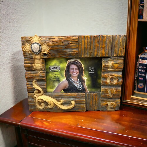? This Western Heart Wall Decor Picture Frame is made of wood and polyresin, hand painted and polished individually.