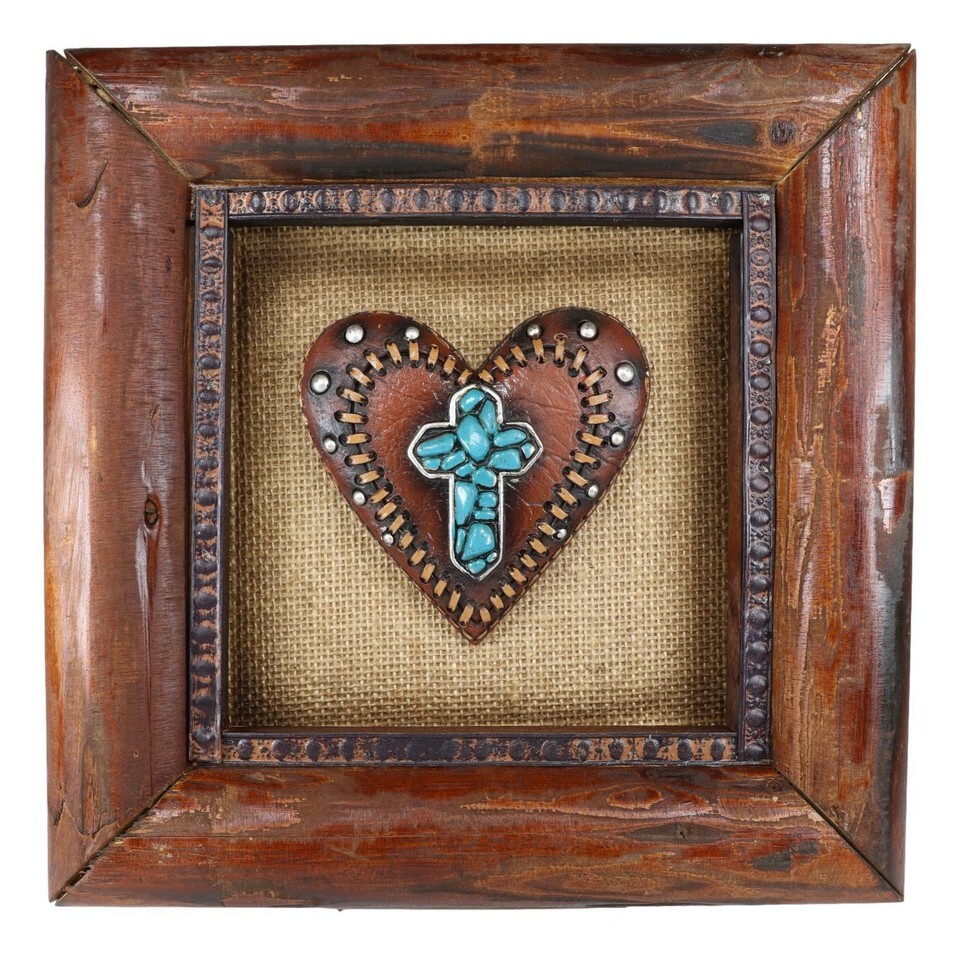 ? Designed to fit into your Southwestern home, this turquoise rocks heart wooden picture frame gives the appearance that it has been in your family for years. With a hand-painted effect of turquoise and faux tooled leather lace and nailheads, this wall decor will be a star and talking point of any party!