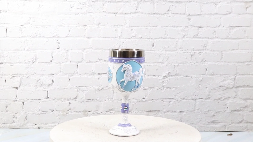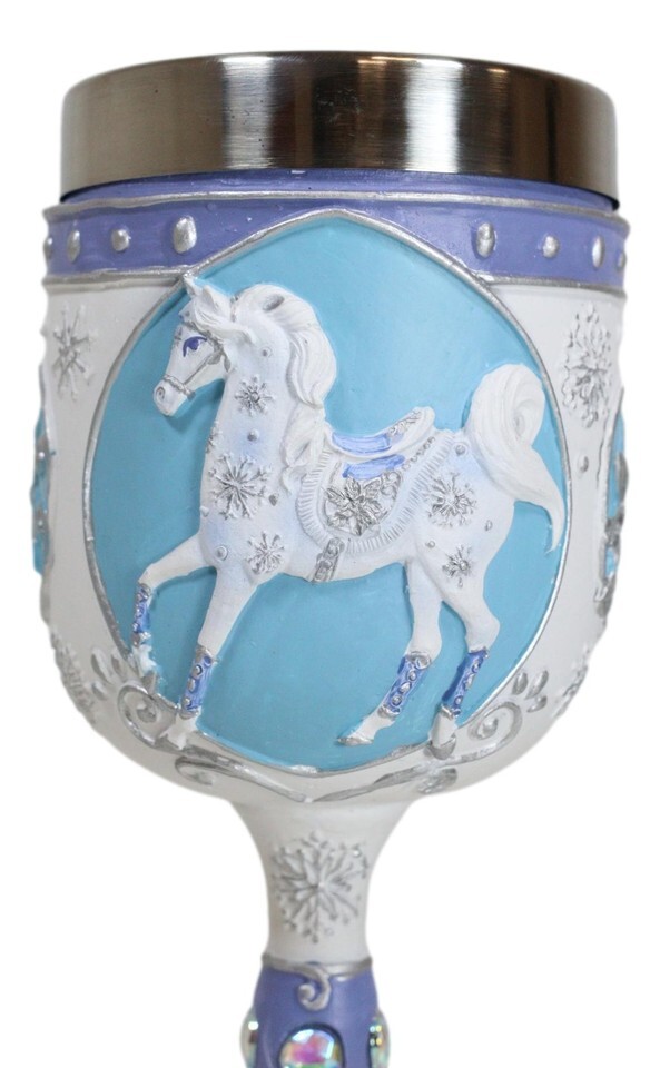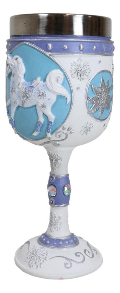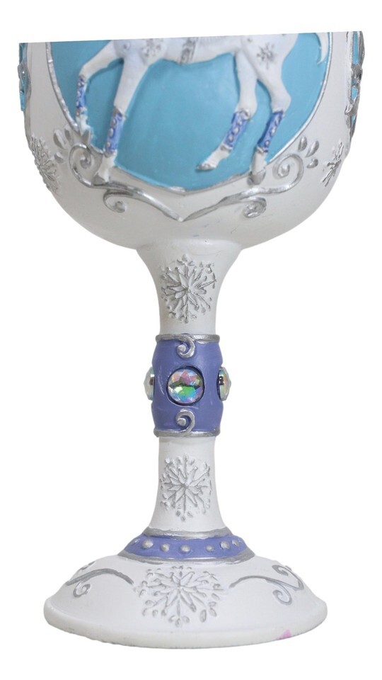 ? The perfect elegant drinkware for a horse lover this winter season! The goblet shows off a prancing white pony in silver snowflake adornments, with more shining poinsettia flowers and leaves around the outside. Blue accents the silver snow and shining jewels glitter on the stem.