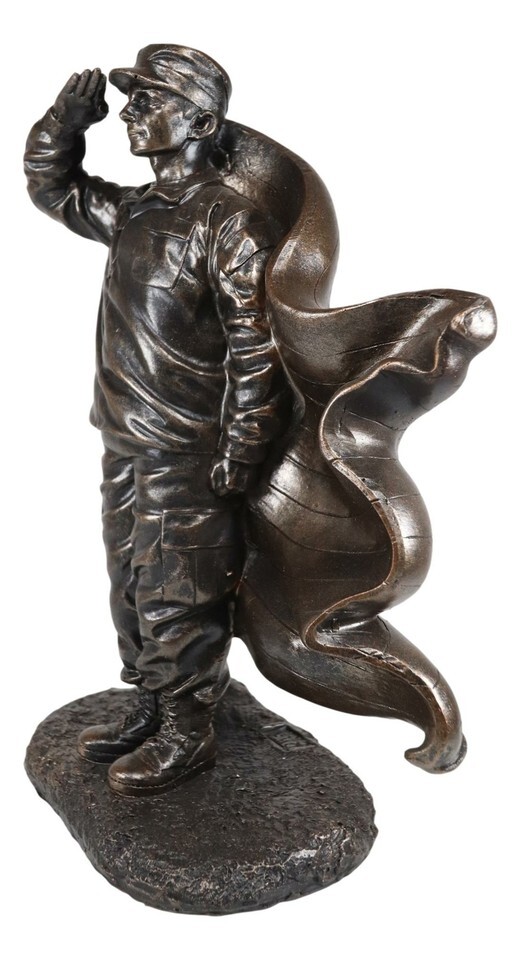 ? This Soldier Standing In Salute To The Flag statue is made of durable composite resin in bronze patina. Item is expertly Hand Painted and polished individually.