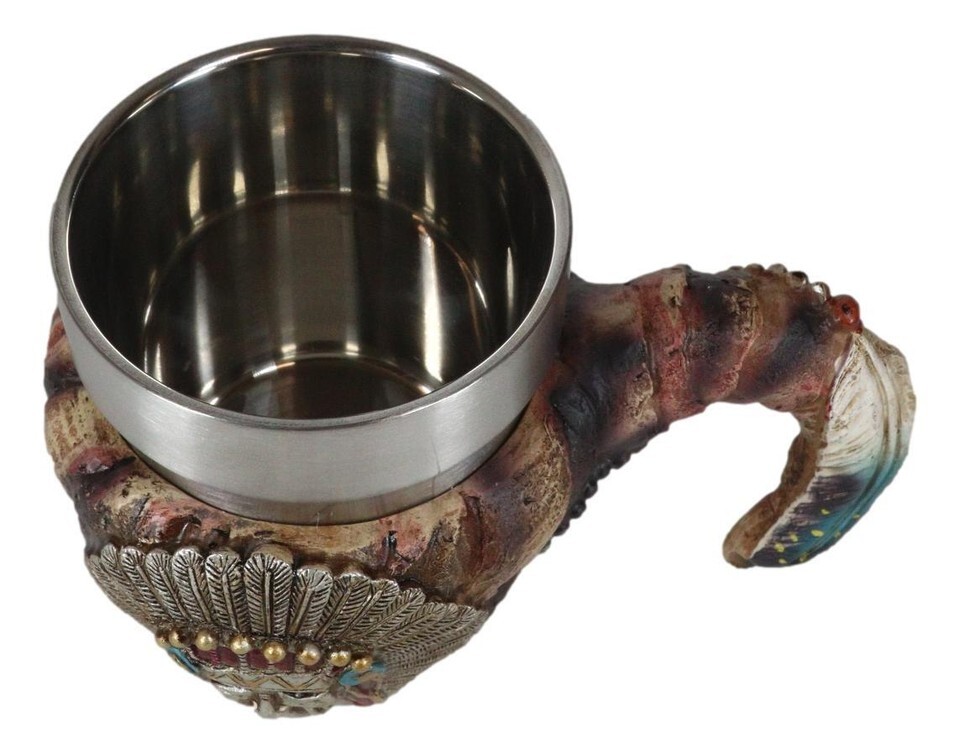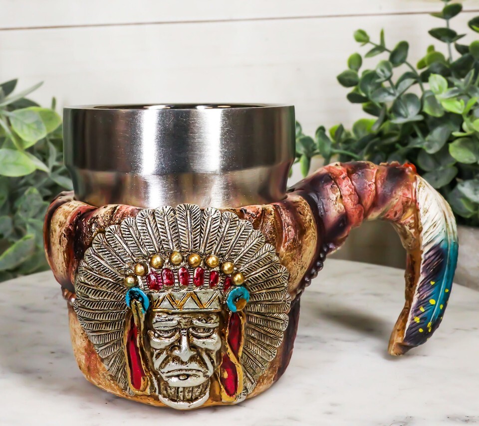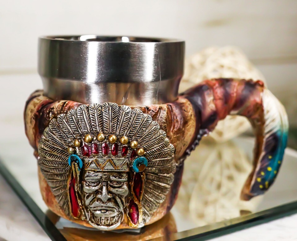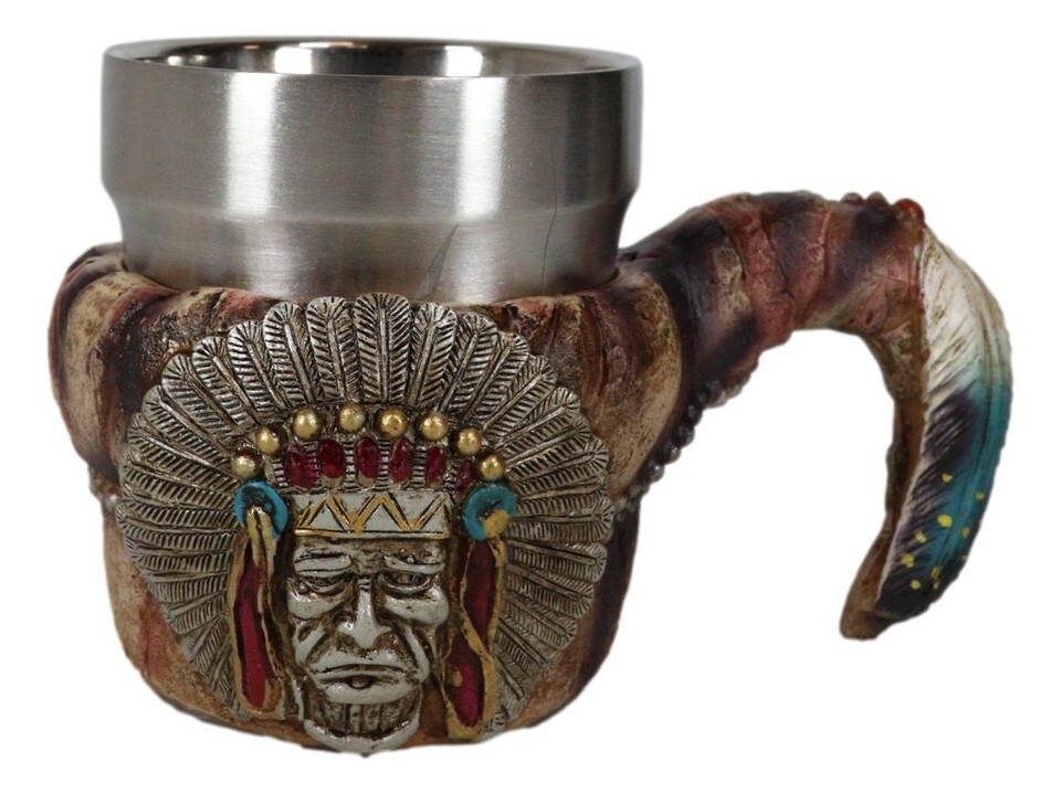 ? This Indain Chief Coffee Mug is made of fine polyresin and stainless steel, hand painted and polished individually.