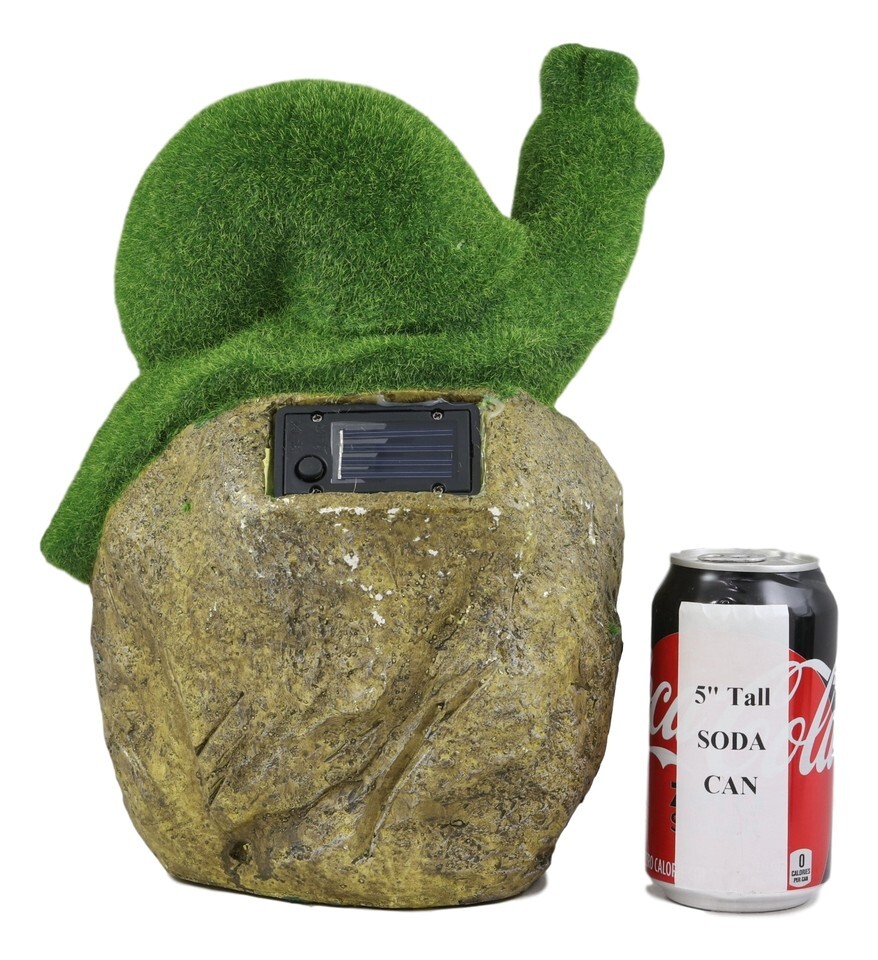 ? This Snail On Solar LED Rock Garden Statue is made of designer composite resin, hand painted and polished individually. The surface of the resin is flocked with artificial green moss of nylon fiber giving it a delightful warm and inviting appearance.