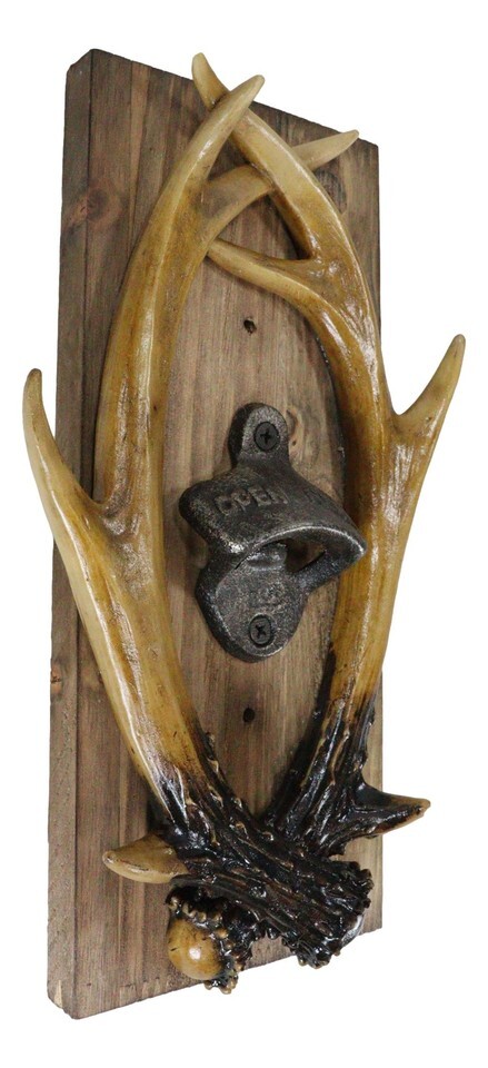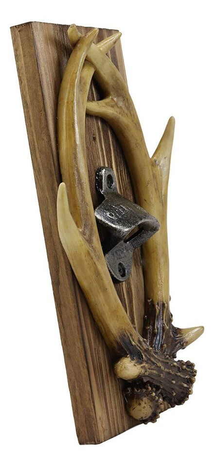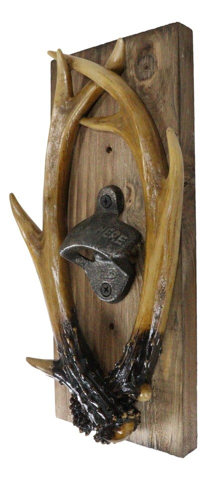 ? Spruce up your western rustic decor with this entwined antlers trophy mounted bottle opener. Two hand crafted and painted faux antlers are mounted in trophy style against a wooden plank. In the center of the sculpture is a vintage style metal bottle opener, perfect for you and your guests. Opening your soda or beer bottles have never been easier!
