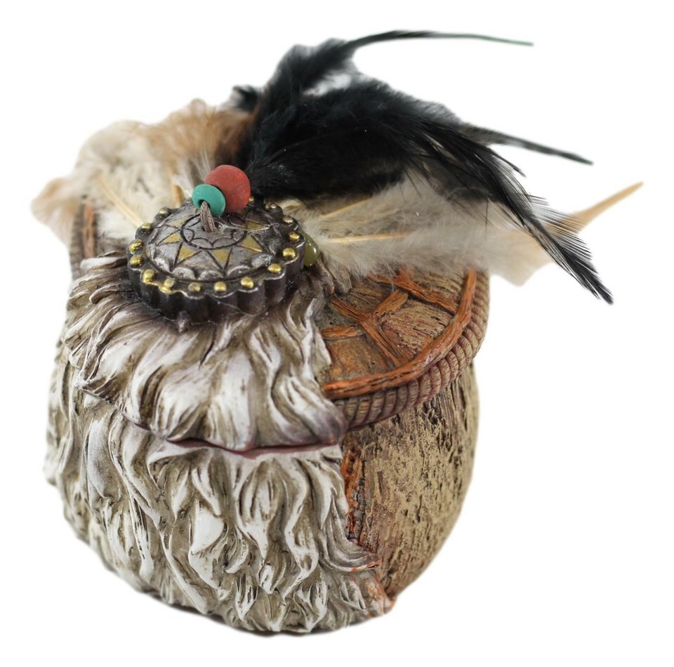? This exotic round dreamcatcher feather box will store your small knick knacks and gizmos gracefully. Decorated with the dreamcatcher feathers, beads and more, the round box is textured throughout like the bison's fur hide. To finish off the decorative box, we add a solar celestial sun medallion to the lid.