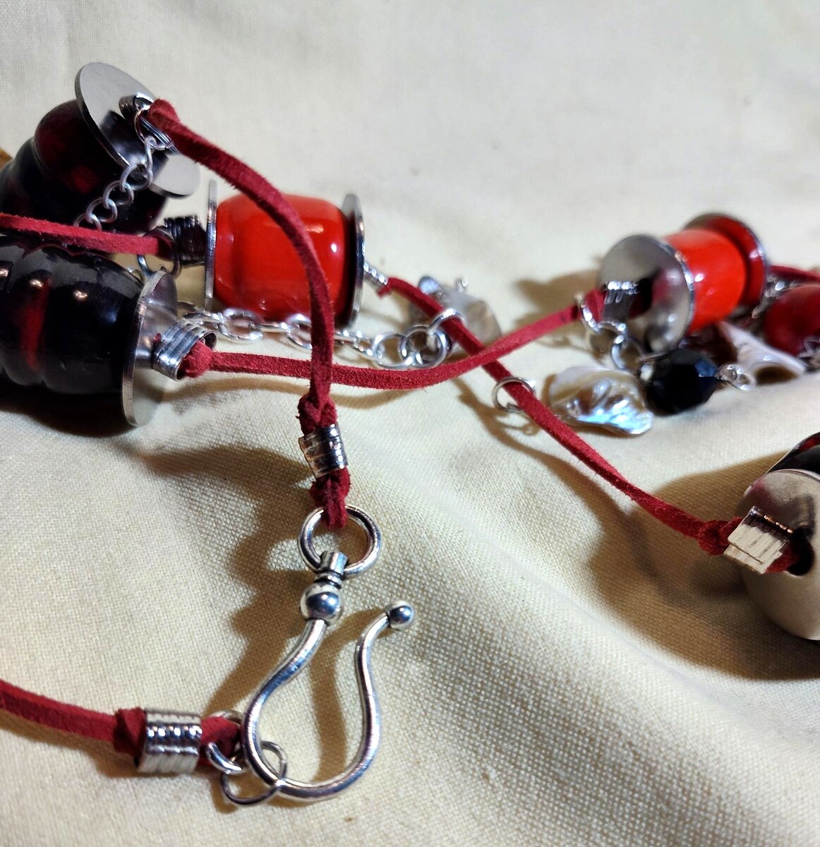 A 30” long CHUNKY Red Cylinder, chain red leather rope necklace.