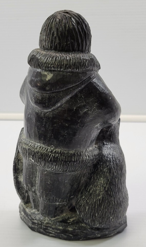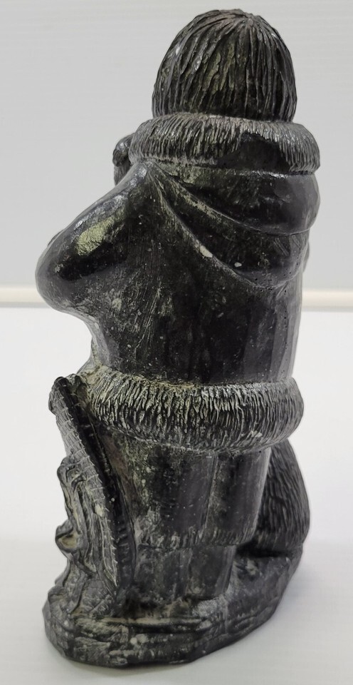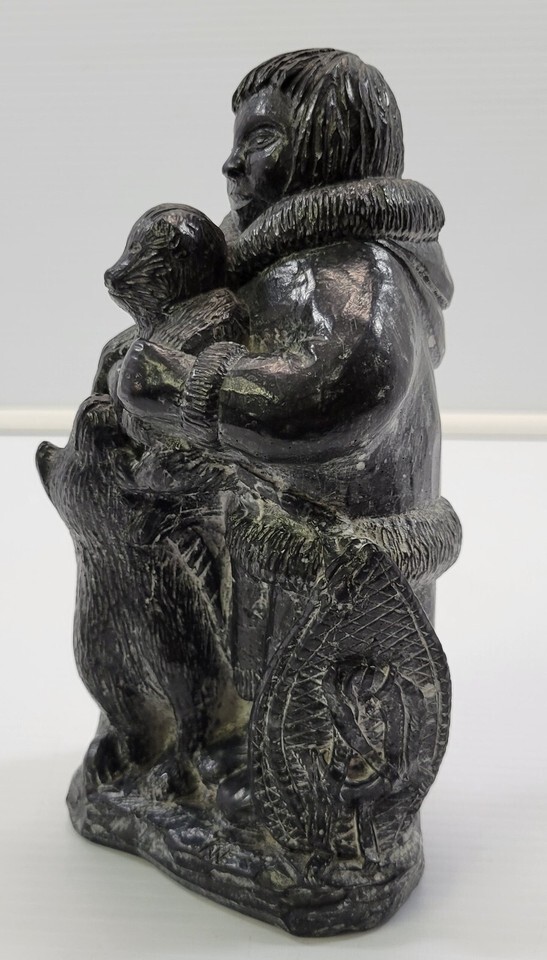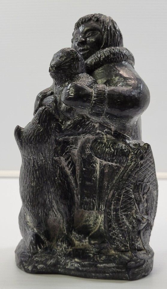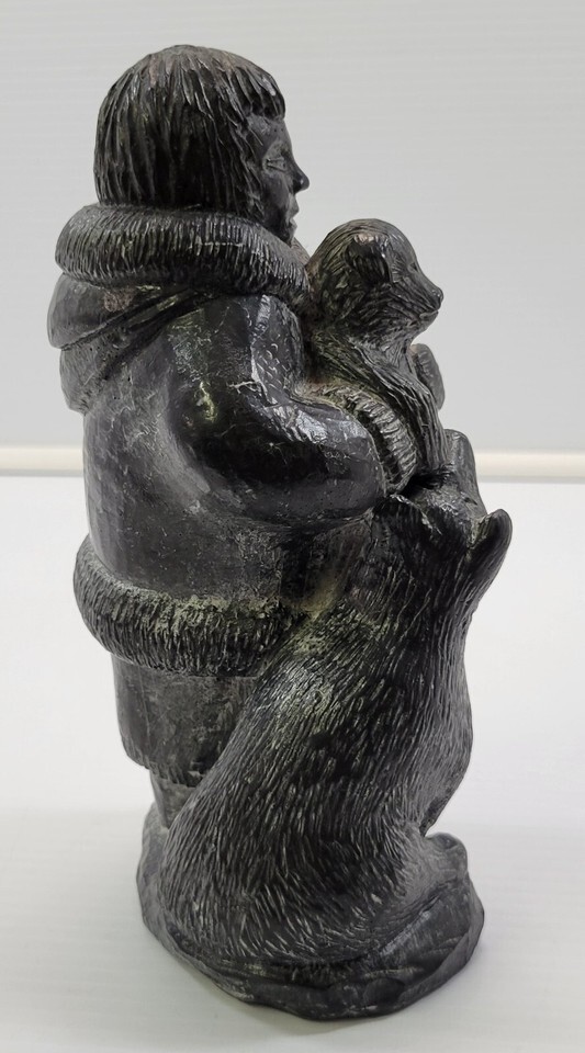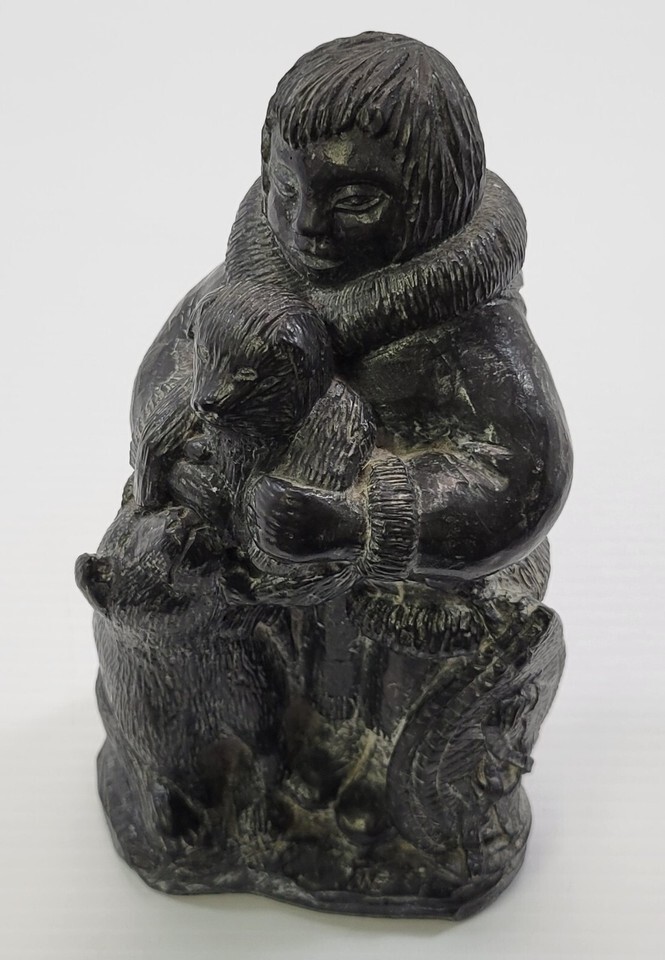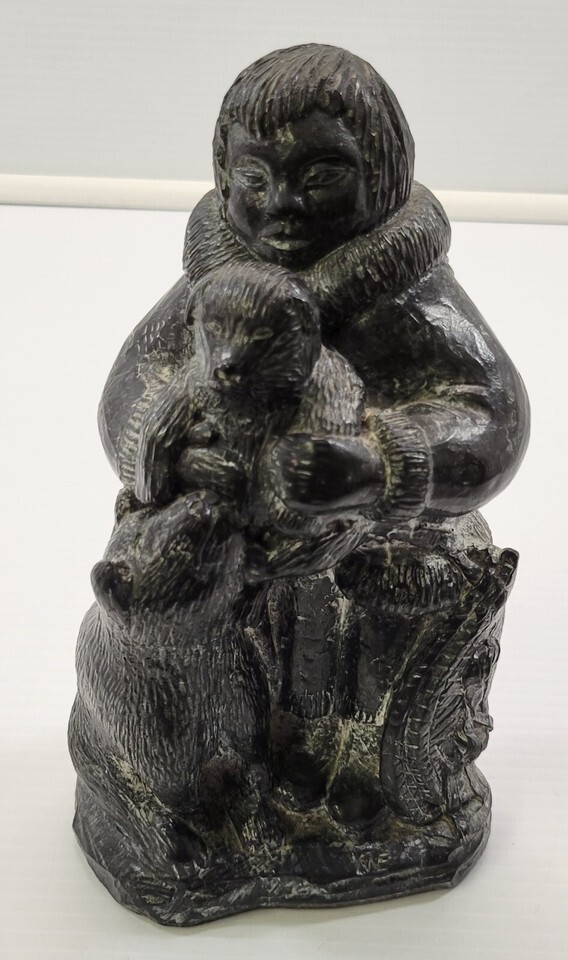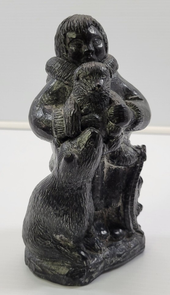 *B2) A Wolf Original Handmade Intuit Soapstone Sculpture Boy with Cub