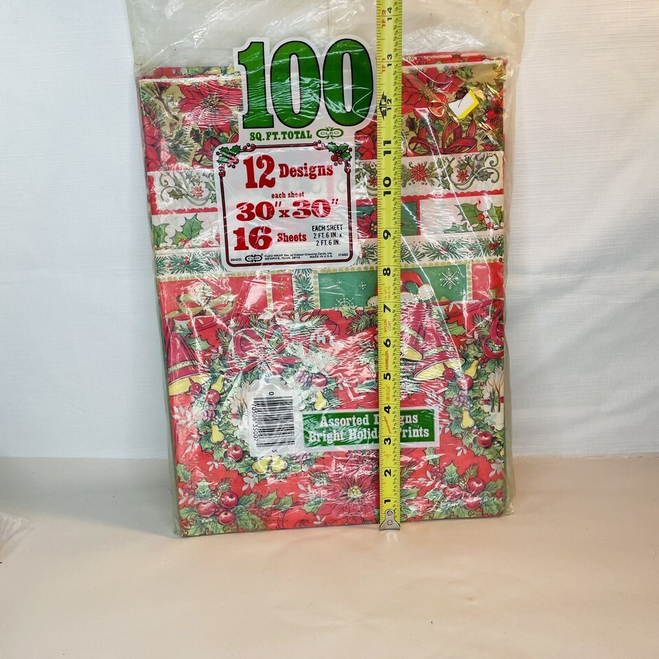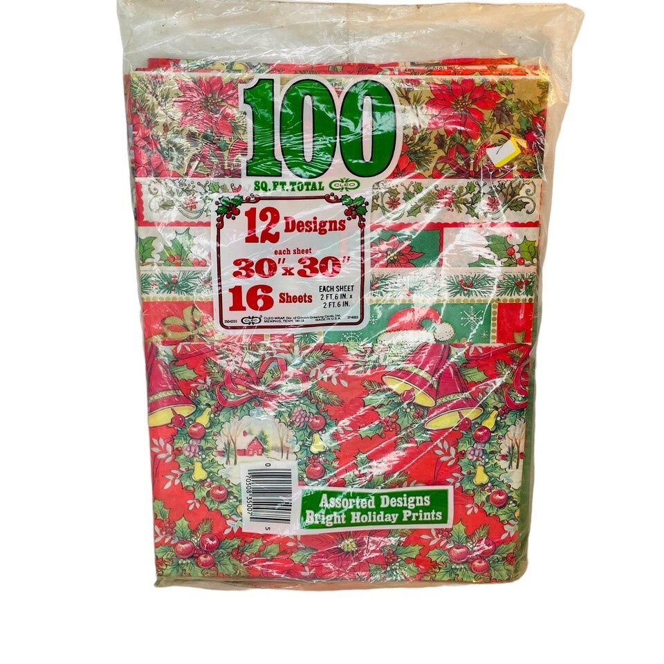 Great package of vintage Gibson (Cleo) holiday Christmas gift wrap in original packaging. Made in USA. Contains 100 feet- 16 sheets- of 30? x 30? sheets. 12 different kitschy designs!