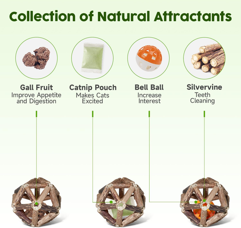 ?Promote Digestion?Catnip and silvervine contain rich dietary fiber, which promote gastrointestinal motility, help get rid of hairballs and improve digestion. If your cats lose interest after playing for some time, you can cut off the exterior of silvervine sticks to intensify aroma, making the balls as appealing as new toys