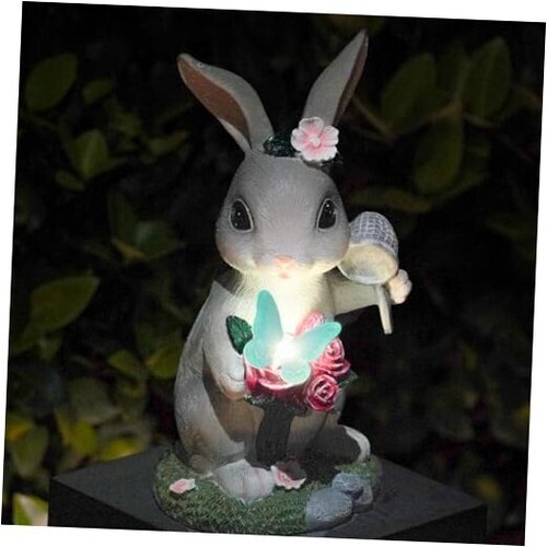 ? A whimsical Rabbit with a cheeky smile sits atop a faux rock with a delightful flower on its corner. The Rock contains LEDs, charged by the solar power of the sun. The solar powered light turns on automatically at dusk is ideal as a courtesy/marker light along pathways, decking, driveways, patios, borders etc.