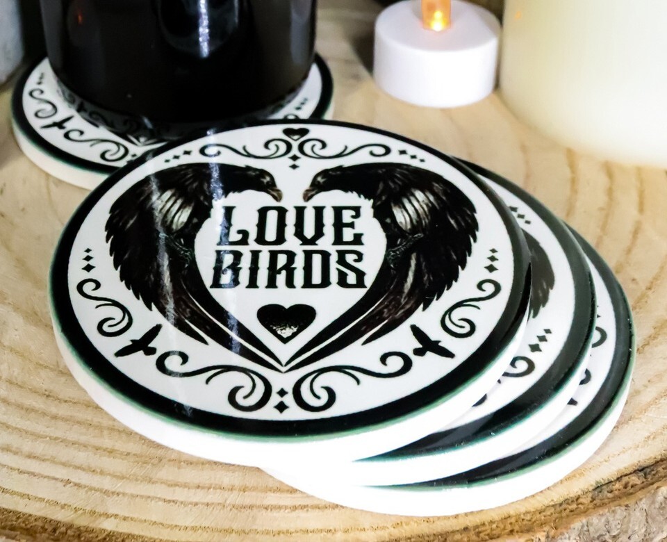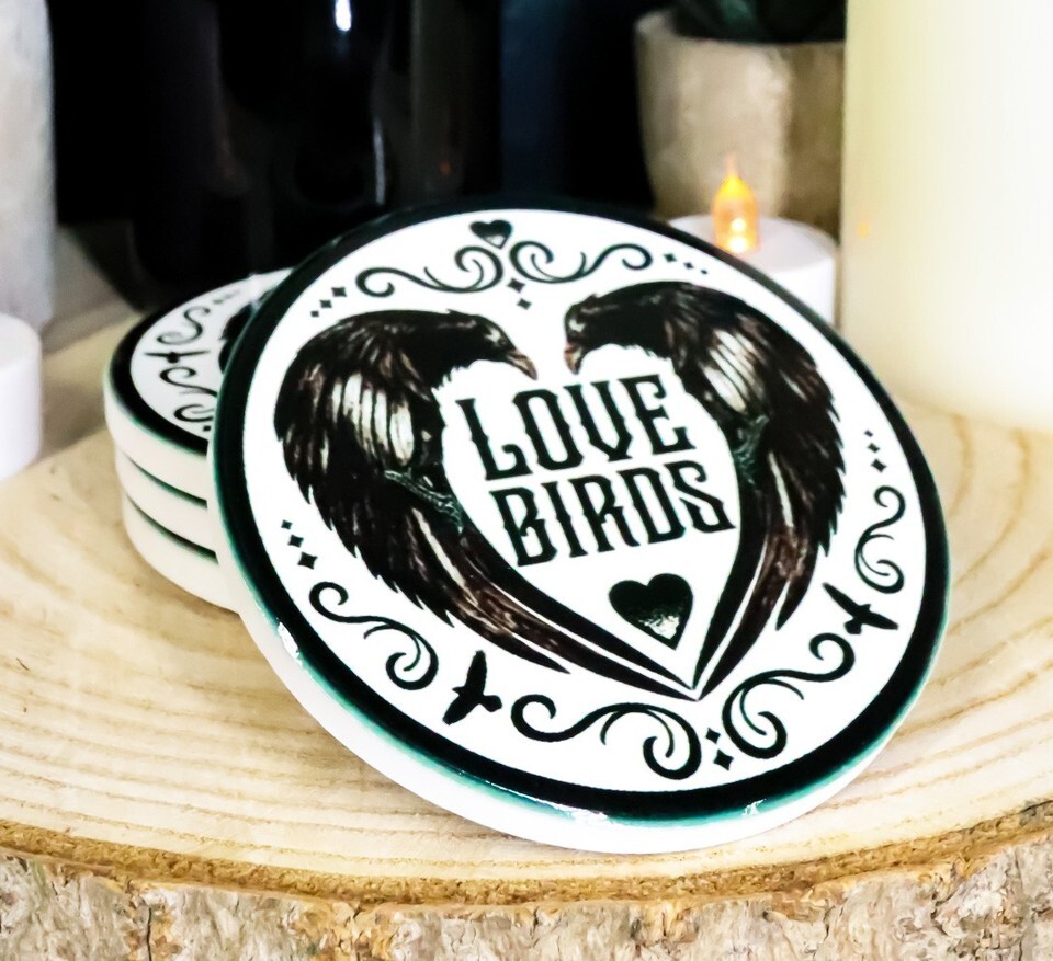 Poe's Raven Heart Love Birds Ceramic Coaster Set of 4 Tiles With Cork Backing