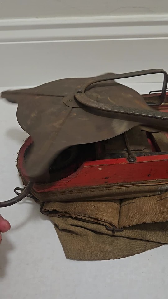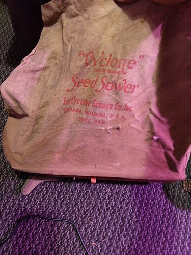 This is a rotary seed sower that is used with the strap over the shoulder. Seeds are placed in the 17 inch by 13 inch cloth bag/hopper, the size of the opening is adjusted to control the flow of seeds, and the hand-crank is used to disperse the seeds. The bottom wood and metal mechanism measures approximately 18 inches by 6.5 inches; the rotary wheel measures approximately 10 inches across at the widest points.