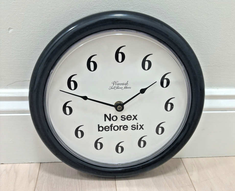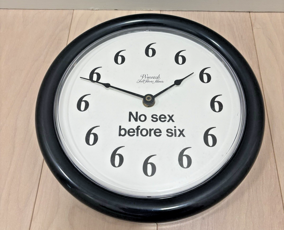 Up for bid is a UNIQUE Working Wuersch Vintage "No Sex Before Six" 10" Clock. This is a "NOS- New Old Stock item that has been tested and is working.