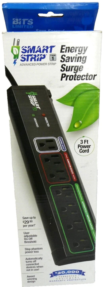 The New Smart Strip Energy Saving Surge Protector is a black surge protector with a 3ft power cord, designed for indoor use. It has a maximum input current of 11-15 A and a surge energy capacity of 1400 Joules. This surge protector from Smart Strip is compatible with appliances up to 1801-2000 W and is backed by a 1-year manufacturer warranty. Made of plastic and featuring a United States plug type, this surge protector also includes a cord for easy use. Perfect for energy savings and protection against power surges, this surge protector is a reliable and efficient addition to any home. SAVE MONEY!!