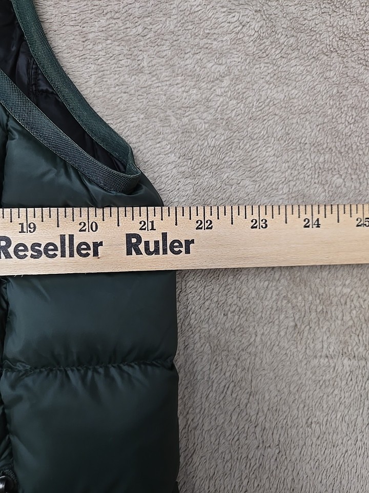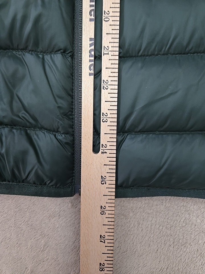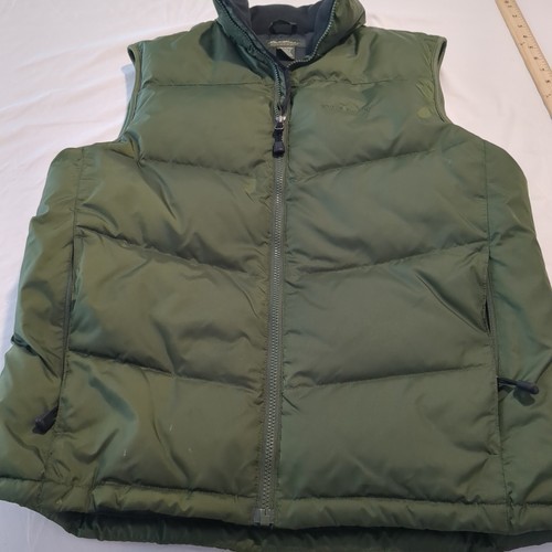 The Eddie Bauer Puffer Vest Cirruslite EB650 Down Men's Size Medium in Green is a lightweight and warm outerwear option for casual occasions. Made with a softshell nylon outer shell and insulated with down, it provides a comfortable fit with a stand-up collar and full zip closure. Featuring a solid green color and a mid-length design, this vest is suitable for all seasons and can be machine washed for easy care. Perfect for outdoor activities like walking and hiking, this vest combines style and functionality for the classic outdoor enthusiast.