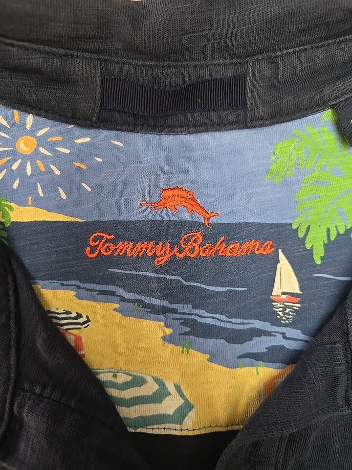 The Tommy Bahama Polo is a men's size large short sleeve shirt in navy blue, made from 100% Pima cotton. It features a collared neckline with a button closure and a spread collar style. This stylish and lightweight polo is perfect for various occasions like travel, parties, casual outings, and workwear. The shirt is designed with a solid pattern and is machine washable for easy care. With its beach and island-themed design, this Tommy Bahama polo is a great choice for those looking for a relaxed and comfortable yet stylish option in their wardrobe.