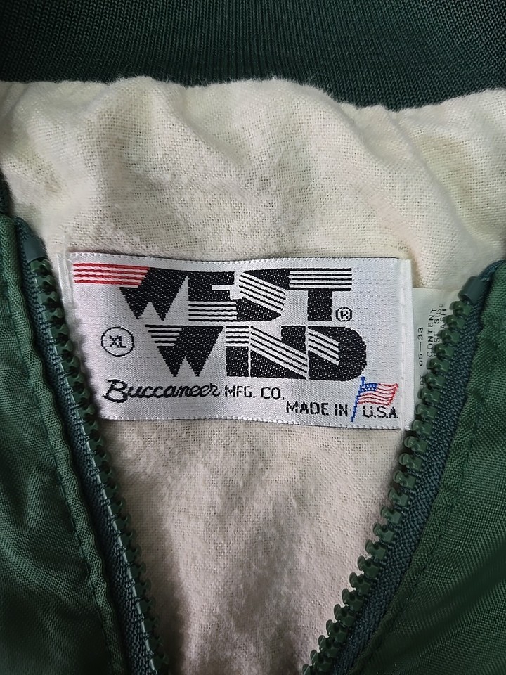 The West Wind Vtg Quarter Zip Jacket is a retro piece made in the USA by West Wind under the Buccaneer brand. This green and yellow striped jacket features a 1/4 zip closure, band collar, and a regular fit, making it perfect for casual occasions. With a nylon outer shell and synthetic insulation, it is suitable for various activities such as walking and baseball. This vintage bomber jacket is machine washable and ideal for all seasons, adding a touch of Americana style to any wardrobe.