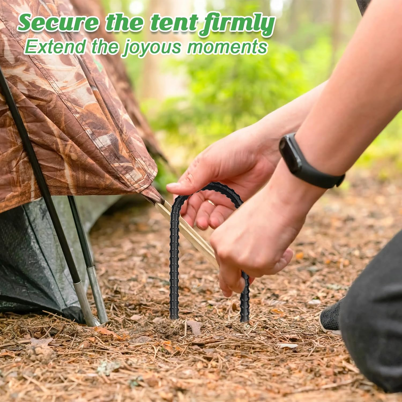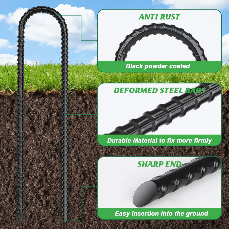 ?KEEP YOUR KIDS SAFETY?Children's safety should be given priority. 12 inch U-shaped rebar stakes can prevent the trampoline from overturning or moving during use,and protect children from falling down and hitting the ground. For the safety of your baby and the peace of mind of parents, every parent should consider buying some extra things to fix your trampoline,camping tent or your child's football goal and swing