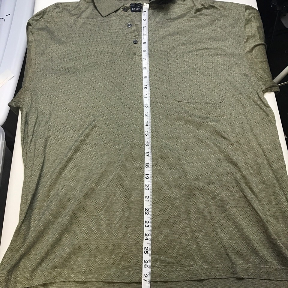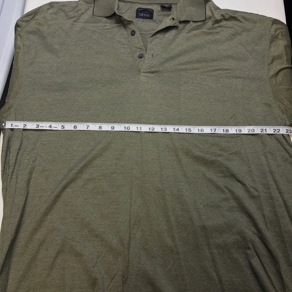 You Are Buying a IZOD Golf Polo w/ an Army Green Geometric Design. Armpit to armpit-23" Neck to bottom-27" In excellent condition, no stains or holes!