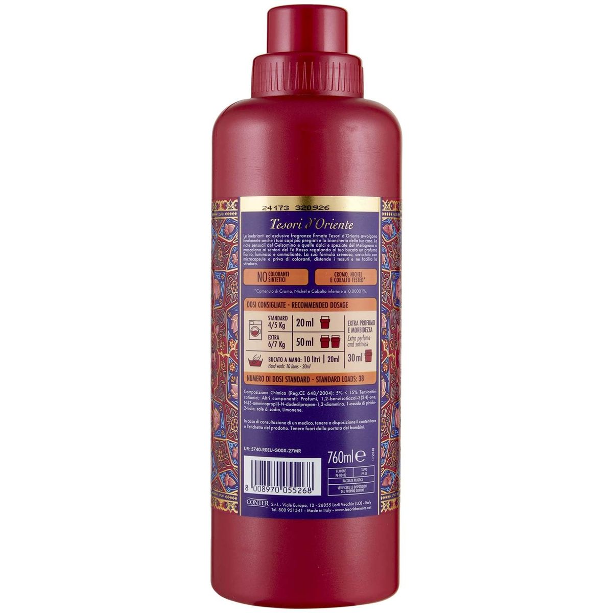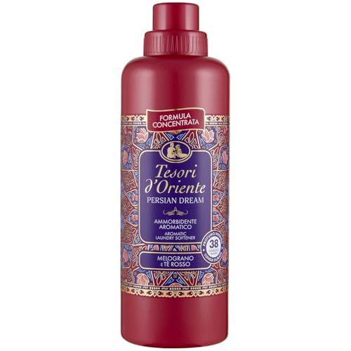 Product description: Tesori d'Oriente FABRIC SOFTENER PERSIAN DREAM - Pomegranate Red Tea The exclusive and inebrianting scentes by Tesori d?Oriente embrace your most precious garments and houselinen. The sensual notes of Jasmine and those sweet and spicy Pomegranate mix with the scents of Red Tea giving to your laundry a floral, intense and bright scent. Its creamy formula, free from colorants, slackens fabric and eases ironing. 760 ml - 38 washes Share