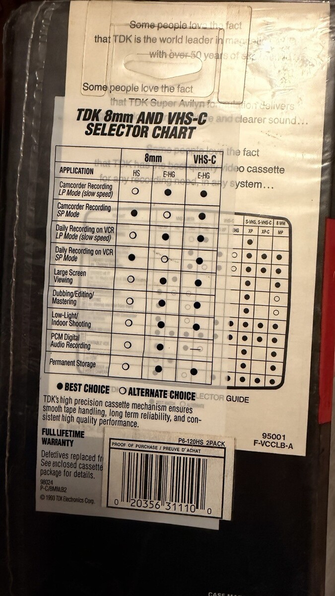 The TDK 8MM (2) Video Cassette Tapes High Standard HS120 are premium quality cassette tapes manufactured in Japan by TDK. With a capacity of 120 minutes per tape, these cassette tapes are ideal for long-run storage and feature thermal printable labels for easy labeling. The tapes are sealed in jewel cases for standard packaging and are scratch resistant for added durability. Made during the 1990s, these recordable tapes are a reliable choice for capturing high quality video recordings.