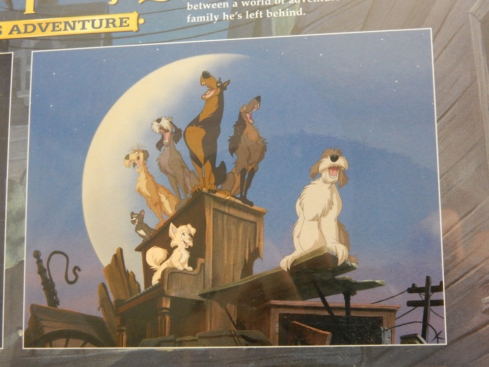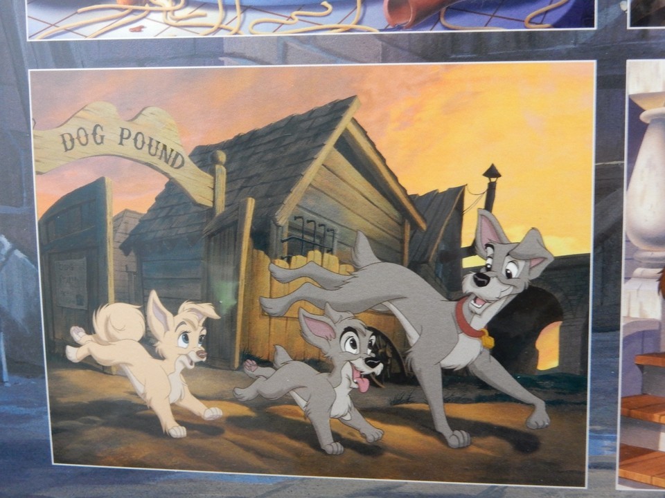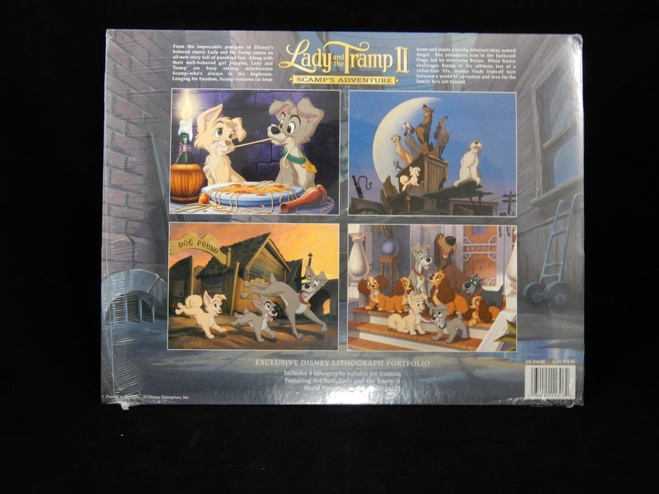 Up for sale is a SEALED Disney Store Exclusive Lithograph Portfolio of Lady the Tramp II Scamps Adventure. These measure approx. 11" x 14". The four lithos show Scamp Angel eating a plate of Spaghetti, The Junkyard Dogs, Tramp with Scamp Angel and the whole gang together on the front porch. There is little wear to one of the corners.