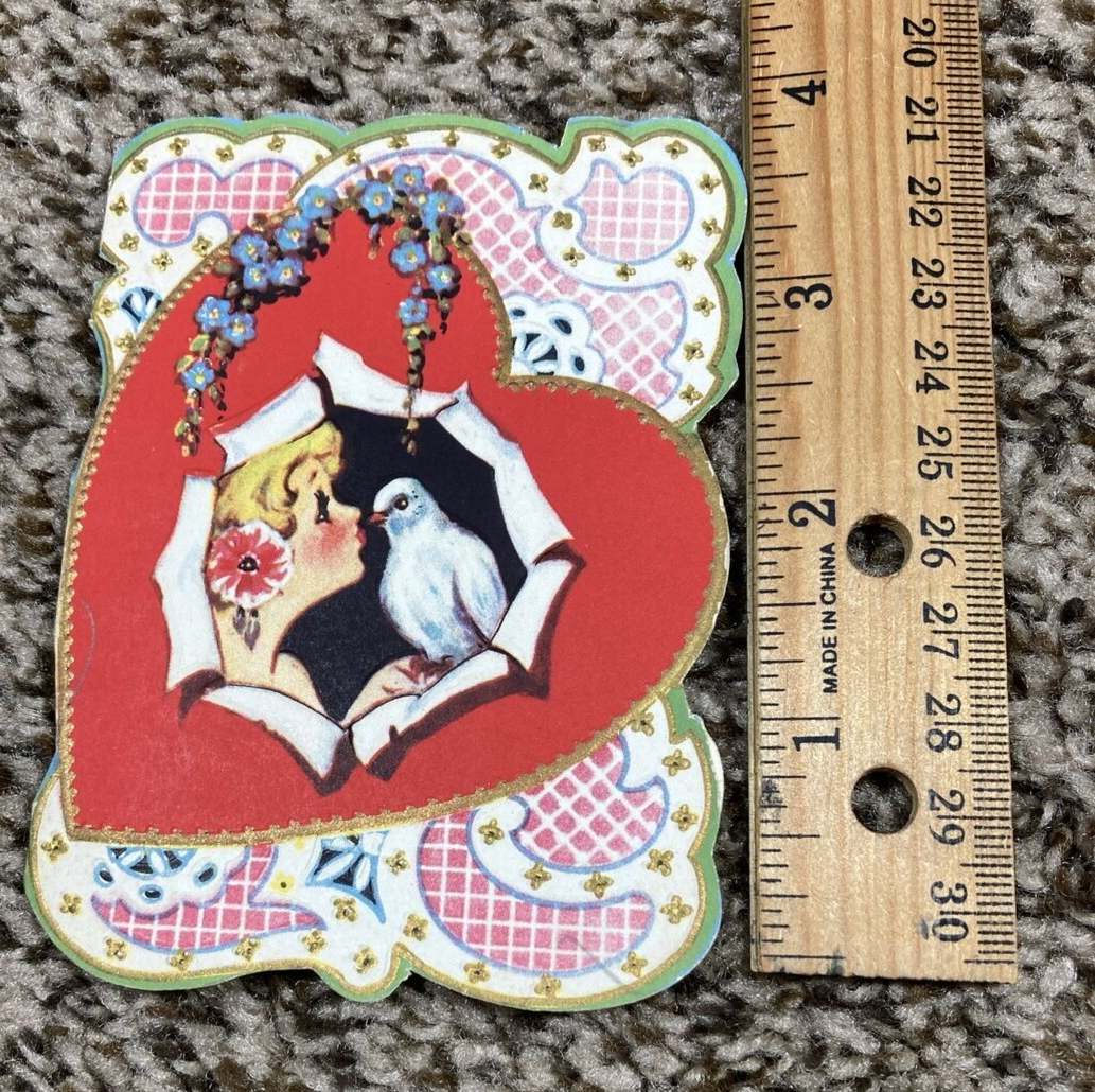 Vintage Valentines Day Card Girl Kissing Dove A Love Bird Seeks Its Mate