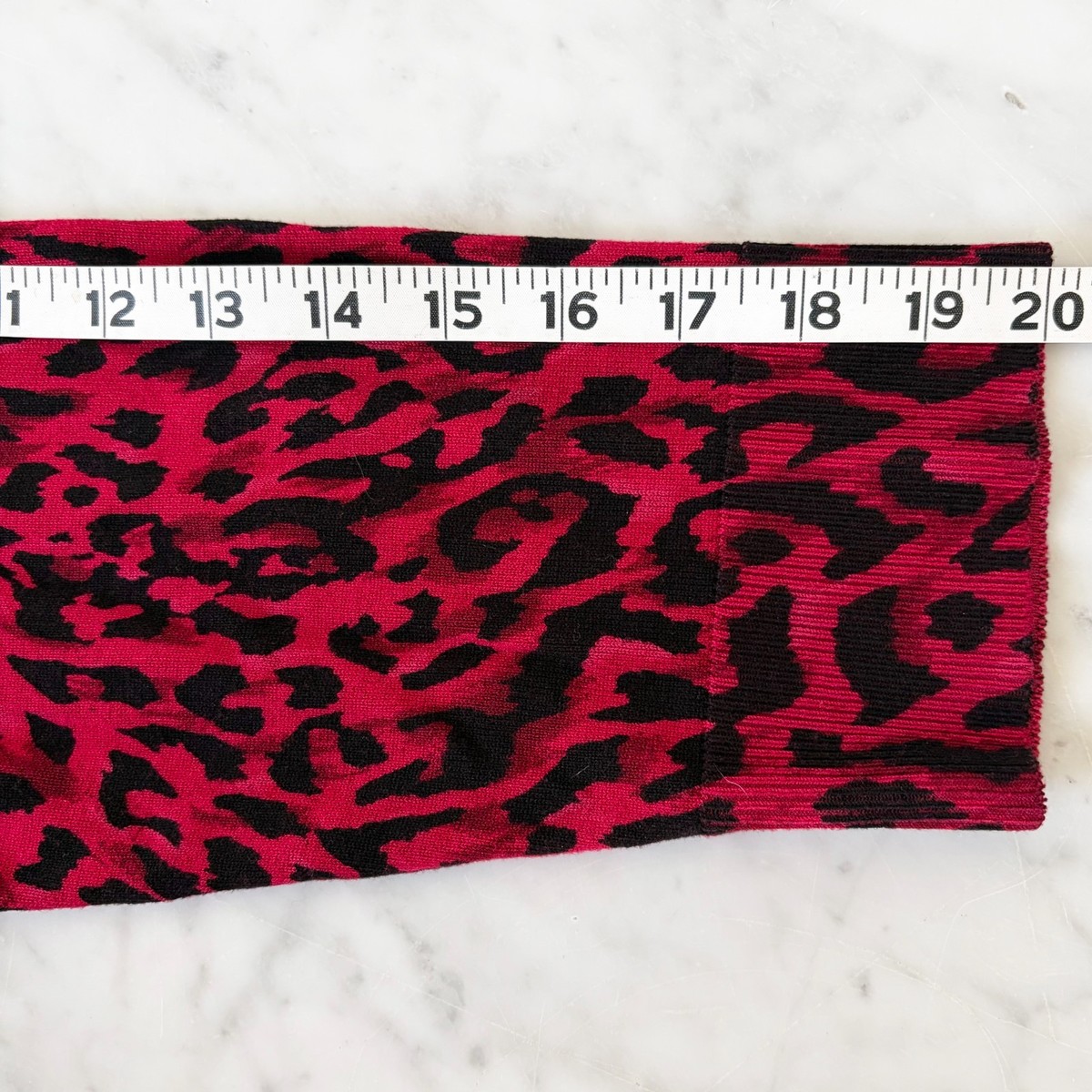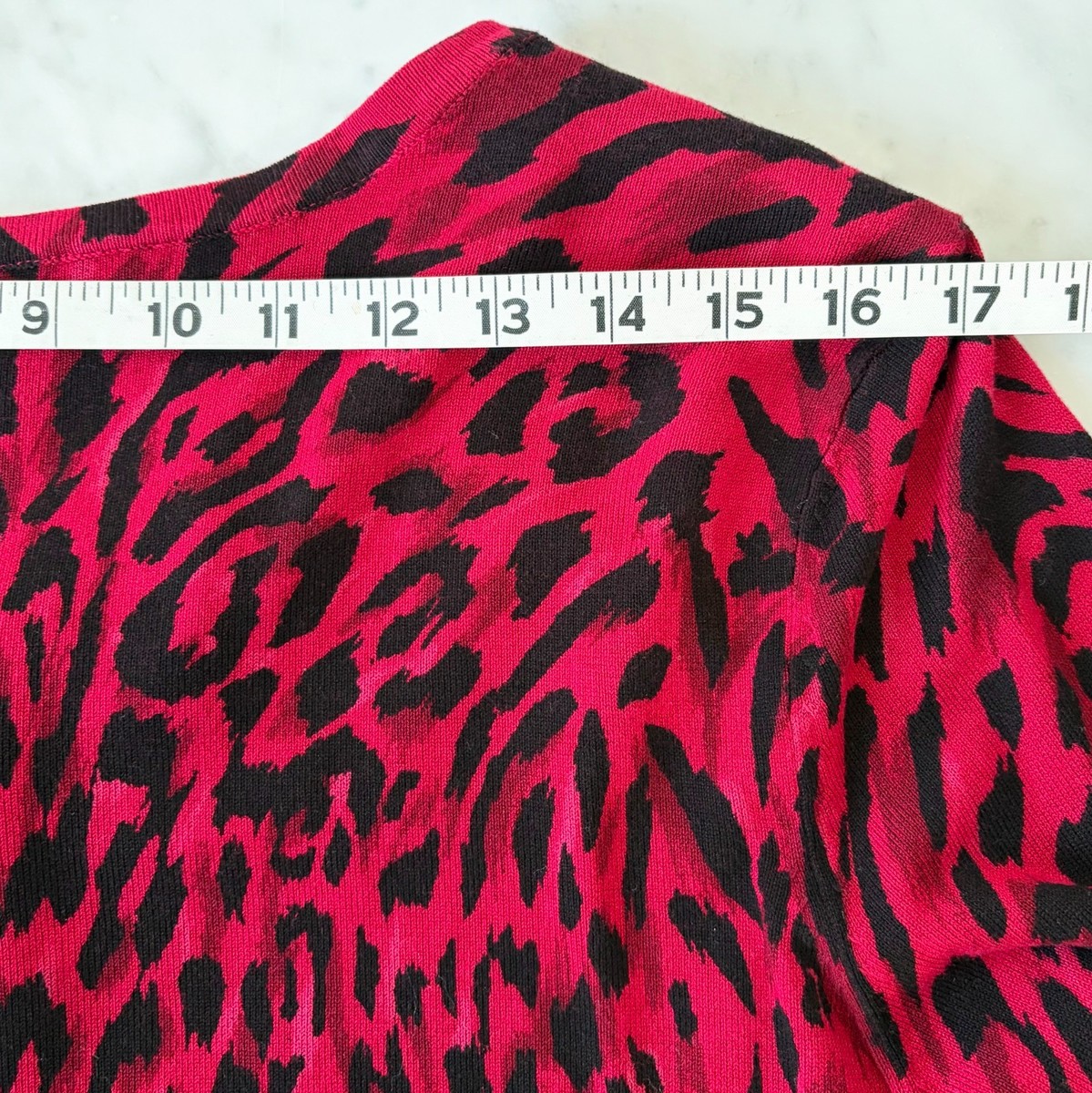 White House Black Market women's size XL red and black leopard print cardigan sweater. Round neckline with nine snap-front. Black lace lining at neckline. Three-quarter length sleeves. 77% Rayon, 23% Nylon; Machine Wash.