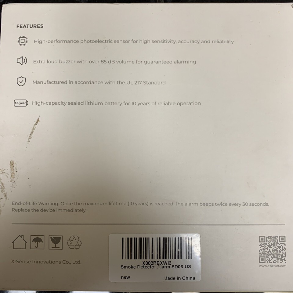 The X-Sense SD06 is a battery-operated smoke detector with a photoelectric sensor that detects smoke and fire. It has an LED light that flashes when the alarm is triggered and emits a loud 90 dB sound. The smoke alarm has a diameter of 3 inches, a depth of 2 inches, and weighs 0.5 lb. It comes in white and requires one battery, which is not included. The unit has a manufacturer warranty of 10 years and is made in China.