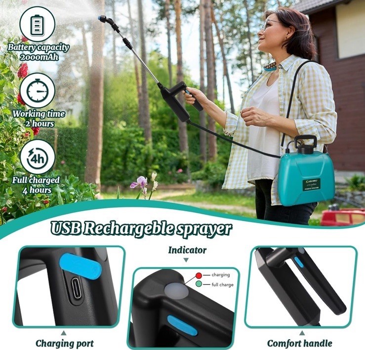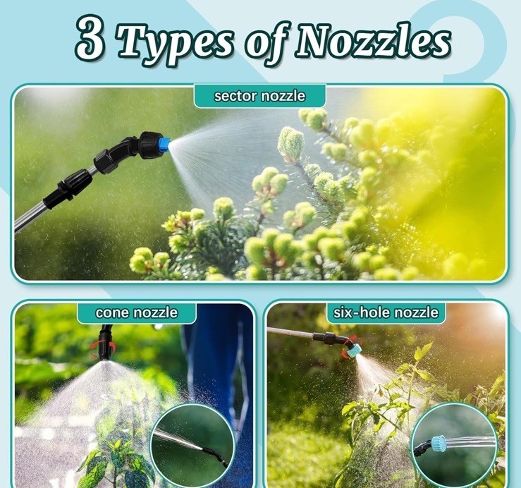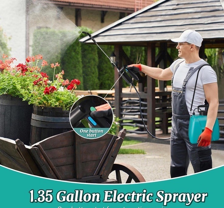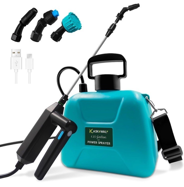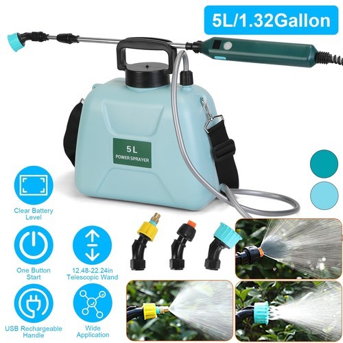 Battery Powered Garden Sprayer with 3 Nozzles, 1.35 Gallon Bluish green