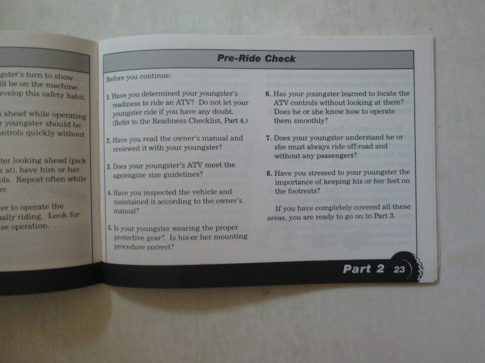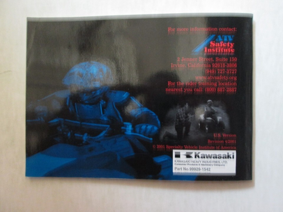 Kawasaki Parent, and Youngsters All-Terrain Vehicles Safety Institute COVERS LIMITED INFORMATION, no missing pages, Step by step instructions, great manual to have when you own Kawasaki. We will leave POSITIVE Feedback after we receive your payment. Please do not forget to give us POSITIVE Feedback and FIVE Stars on all of the Detailed Seller Ratings! If you are not satisfied with your shopping Experience, please contact us to get a solution before you decide to leave a NEUTRAL or a NEGATIVE Feedback, We will do our best to solve any problems for you as soon as possible. We will provide you with the BEST POSSIBLE service because the POSITIVE Feedback and FIVE Stars are what we are striving for. Please email me through "My Messages" or "Ask Seller Questions" if you have any question about