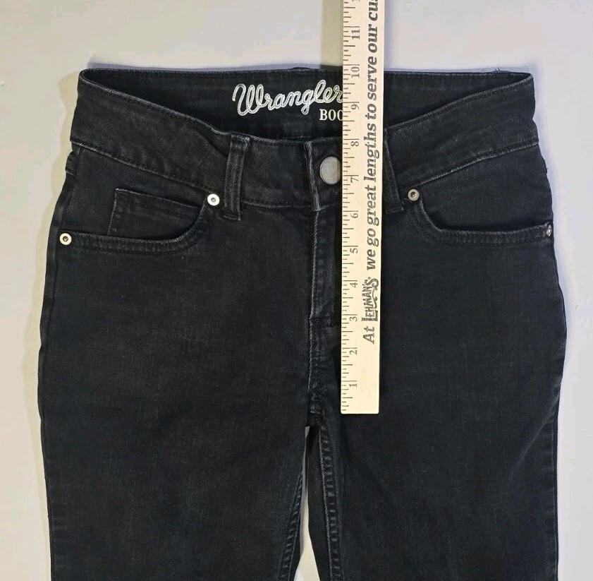 Please see all photos and measurements. The Wrangler Boot Cut Black Denim Jeans for women in size 1/2X34 fit waist size 25 inches and inseam 32.5 inches are made from a comfortable and stretchy denim fabric blend of cotton and spandex. These low-rise jeans feature a flattering bootcut style perfect for the winter and fall seasons. With a classic 5-pocket design and a zip closure, these black denim jeans from Wrangler are a stylish and versatile addition to any woman's wardrobe, fitting for a casual or dressed-up look.
