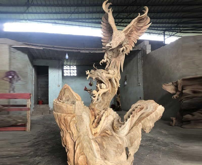 Product description: Transform your space with this awe-inspiring solid wood sculpture, standing over 78 inches tall, that masterfully combines an eagle and dragon in intricate detail. Each piece is uniquely hand-carved from natural wood root, featuring meticulous artistry in every feather, scale, and flowing form. The dramatic composition depicts a majestic eagle soaring above a powerful dragon, creating a dynamic statement piece that commands attention in any grand setting. Perfect for luxury homes, corporate offices, or prestigious venues, this monumental artwork serves as a powerful symbol of success and achievement. The sculpture's natural wood finish highlights the material's inherent beauty while ensuring each piece remains one-of-a-kind. As a statement piece for grand openings or significant milestones, this exceptional sculpture brings artistic mastery and symbolic significance to any distinguished space.