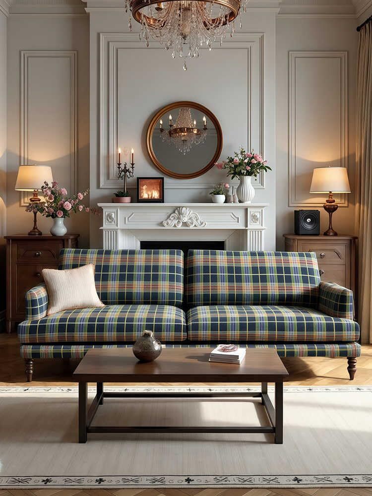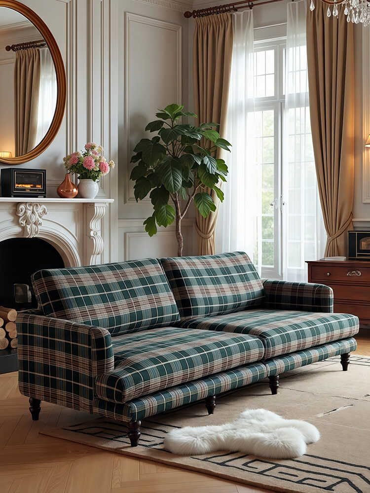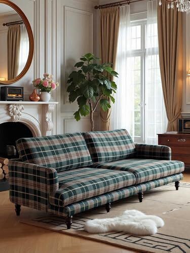 Vintage Plaid Fabric Sofa Classic Lounge Couch for Living Room, Designer South