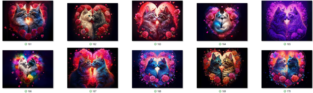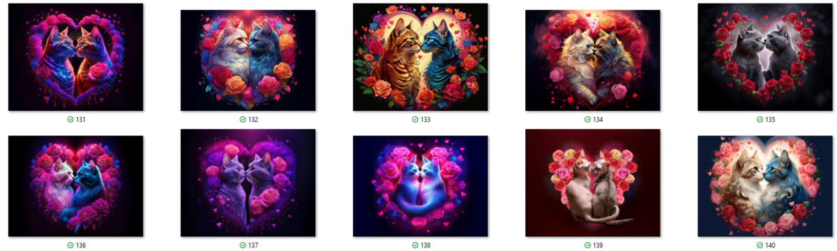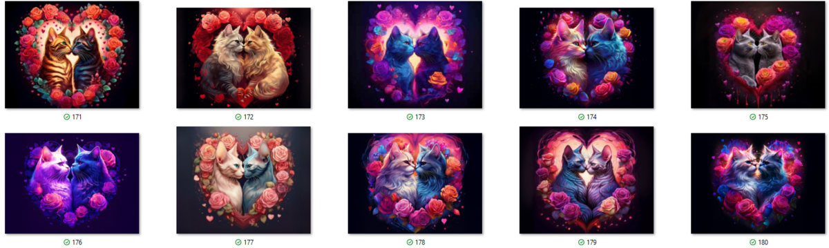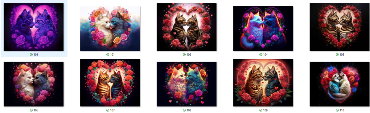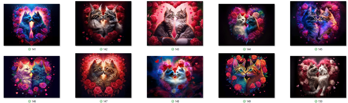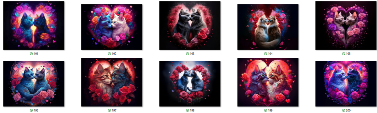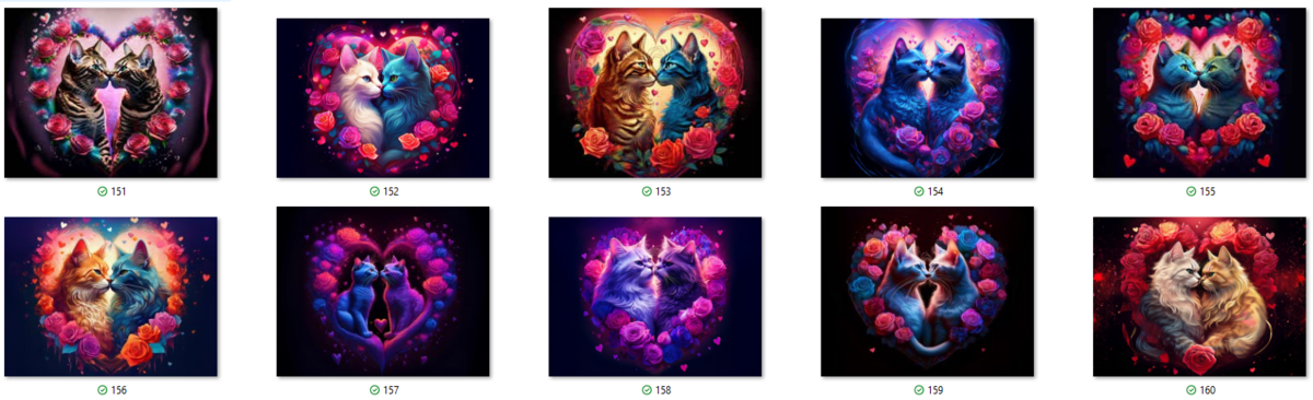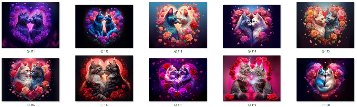 100 image bundle of Valentine cats featuring cute cat couples with roses and hearts.For commeercial use of physical products excluding transfers.