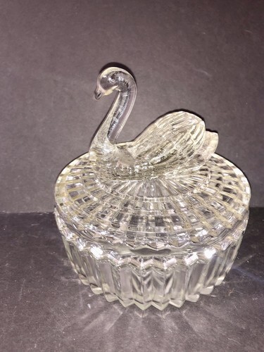 Vintage Jeanette Round Clear Glass Swan Lid Candy Dish Powder Jar Trinket Box