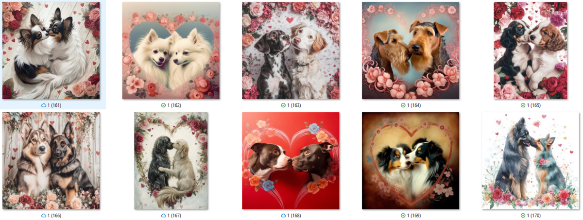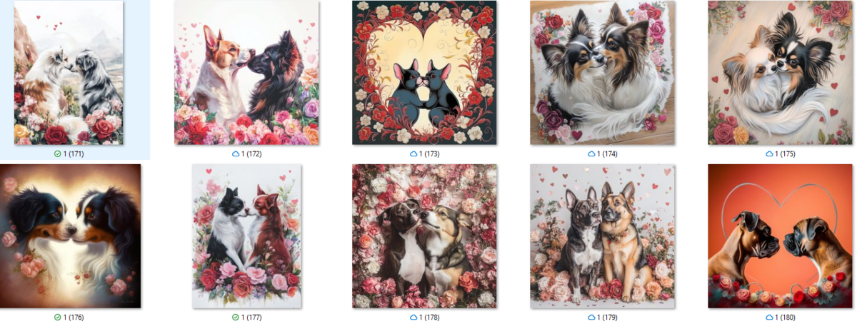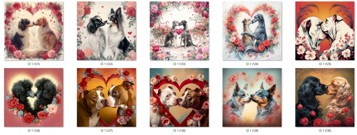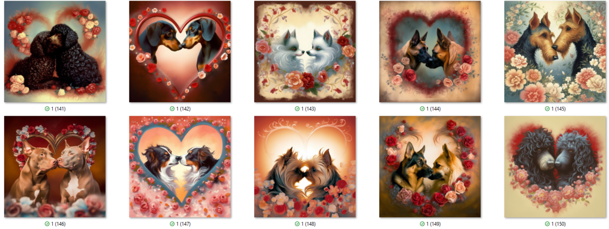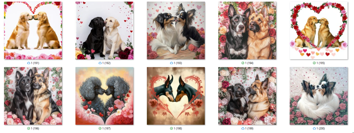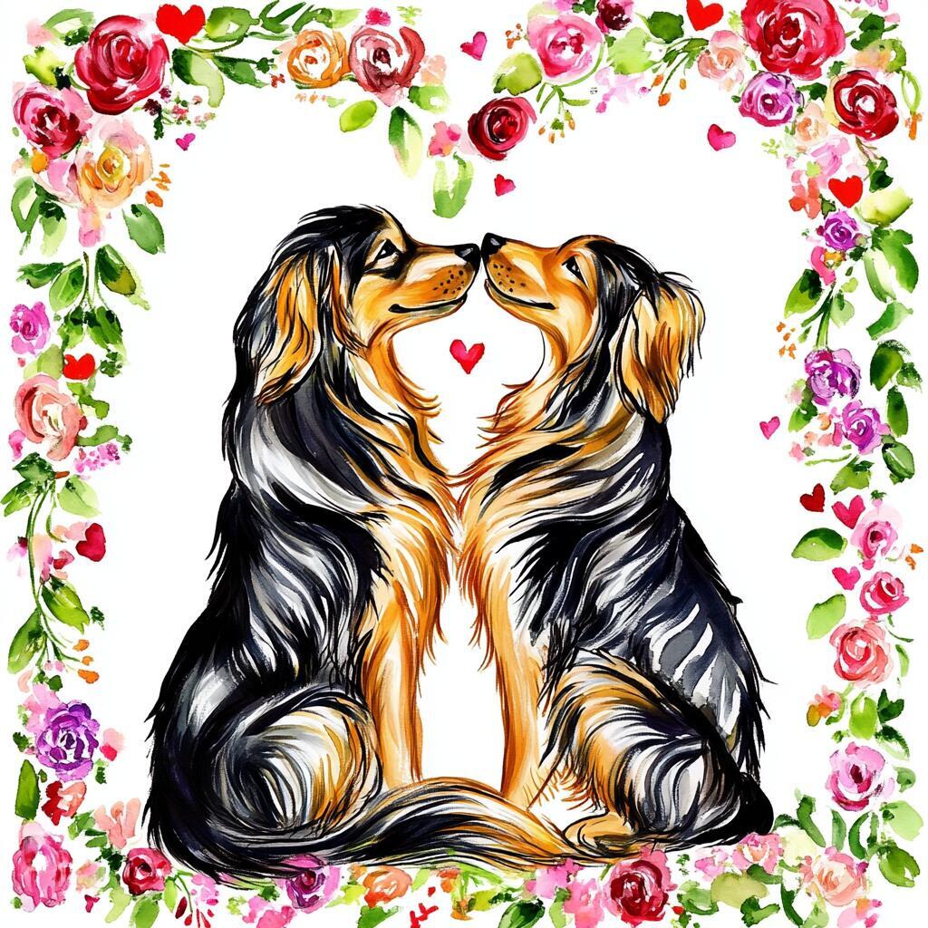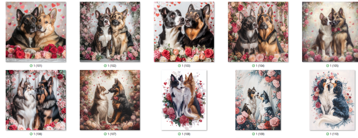 100 PNG image bundle of Valentine dogs featuring cute dog couples with roses, flowers and hearts.For commeercial use of physical products excluding transfers.