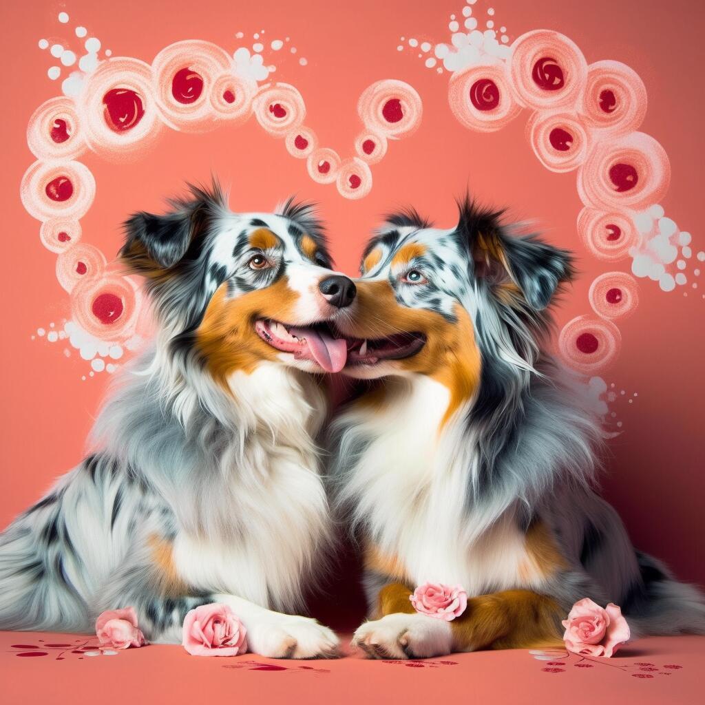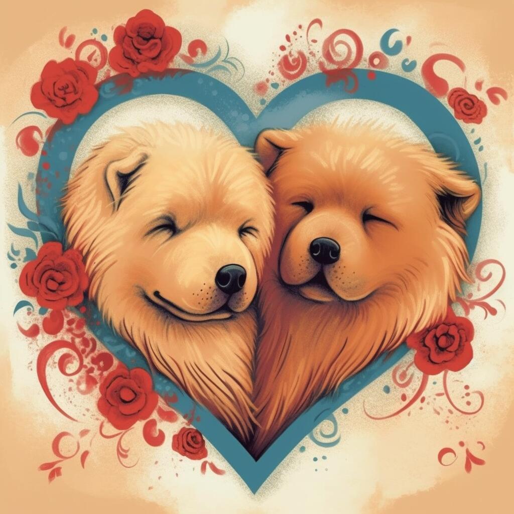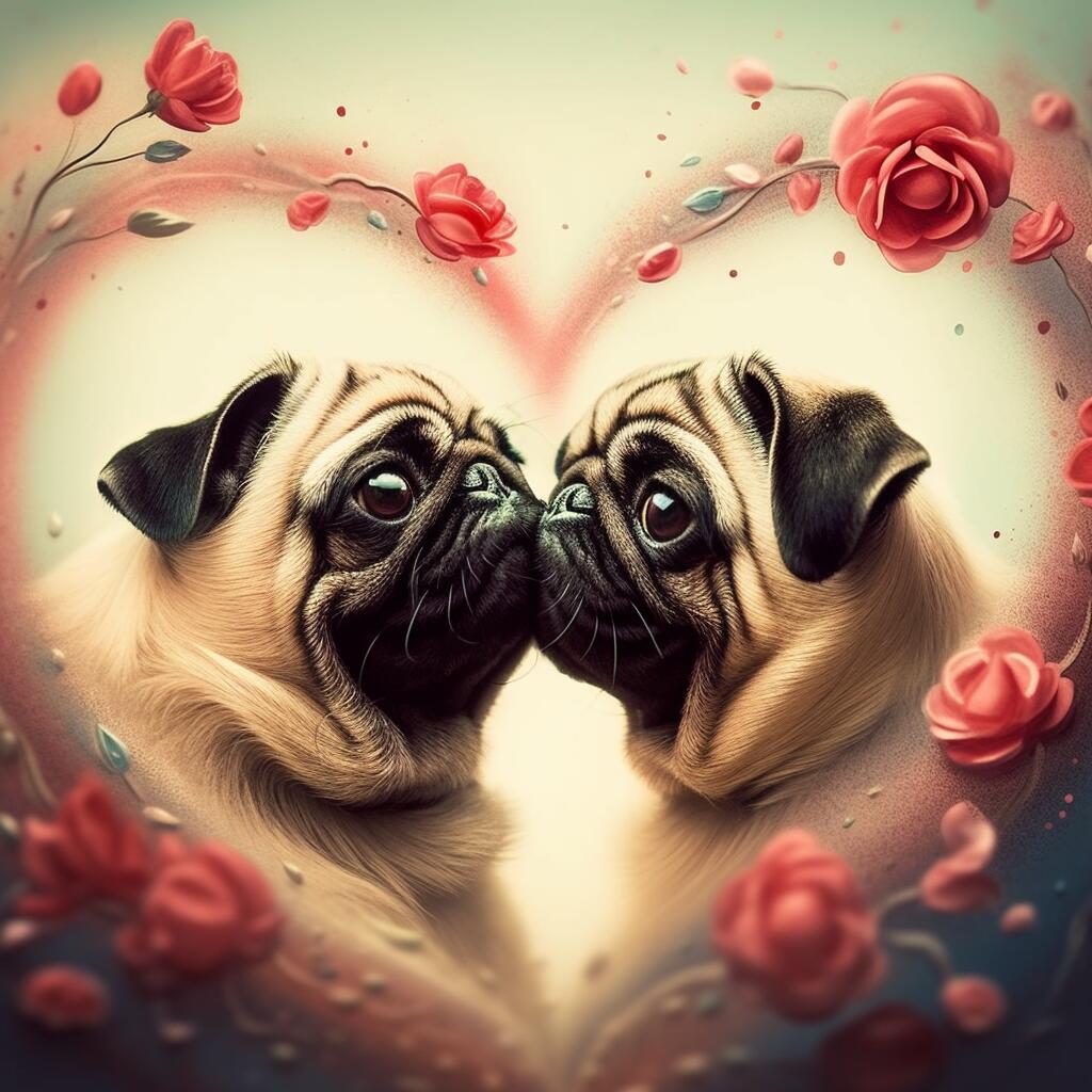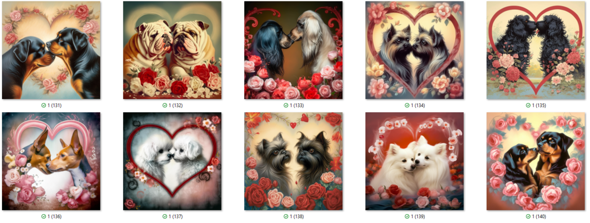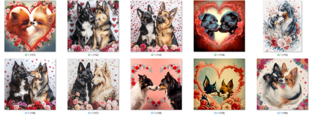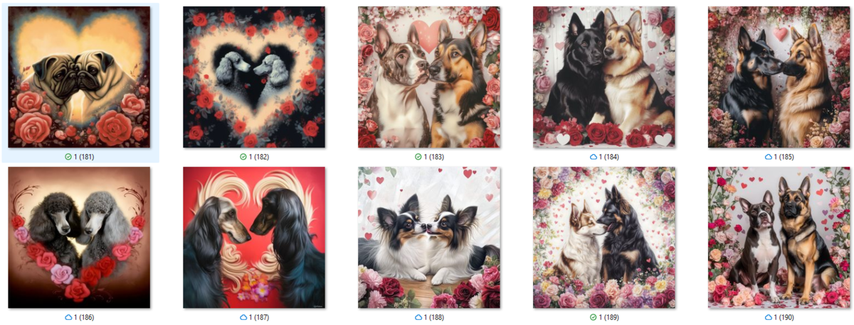 100 PNG image bundle of Valentine dogs featuring cute dog couples with roses, flowers and hearts.For commeercial use of physical products excluding transfers.