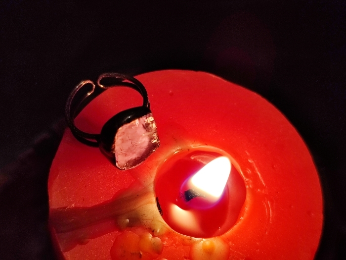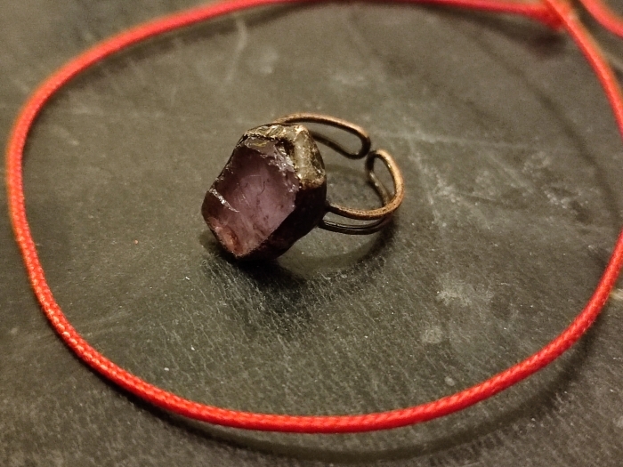 The ring looks modest โ a thin copper band set with a stone of a delicate pink-lilac hue, like traces of dawn in the desert. Yet the moment one takes it in hand, it feels as though the world around pauses for an instant, listening.