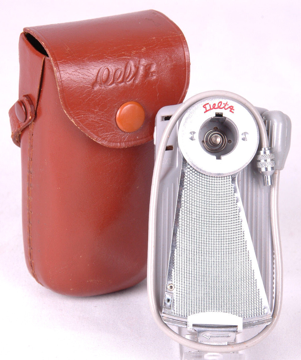 DELTA FAN OUT FLASH BULB UNIT-Brown Leather Case-Sync Cord-Vtg Photography