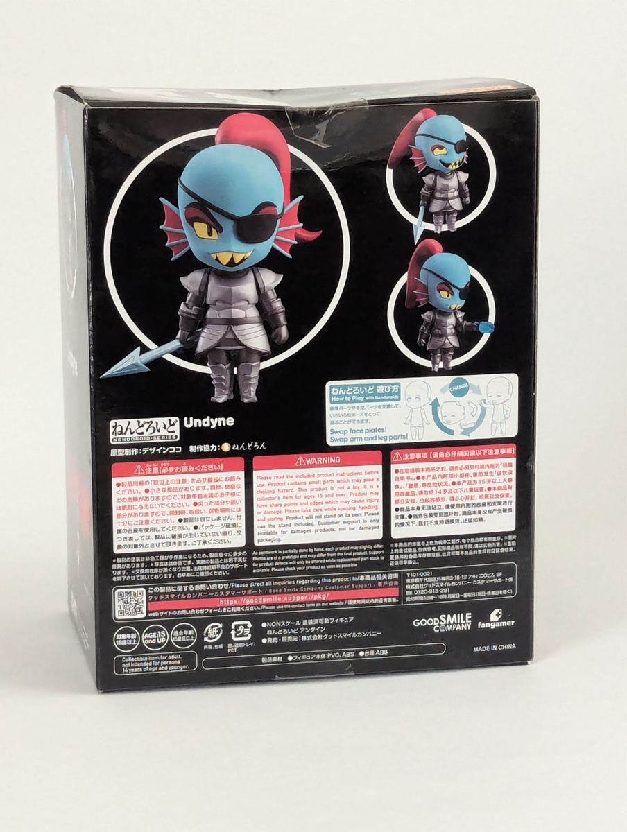 Two interchangeable face plates are included: a standard face and a laughing face. Undyne's harpoon and fish-shaped mug are included as optional parts.