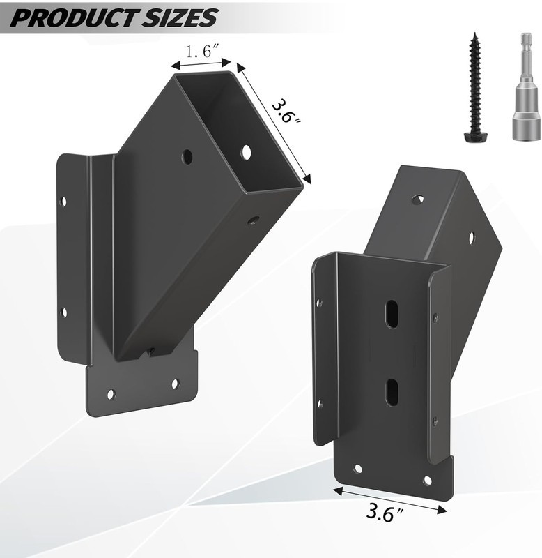 Widely Used: 45-Degree Angle Bracket back size: 3.6? wide, can be mounted to 44 or 46 wood posts (Actual Size: 3.6?? wide are available).Can be used for pergolas, gazebos, patios, sheds, yards, carports, greenhouses, garages, tree houses, or other buildings that need reinforcement.