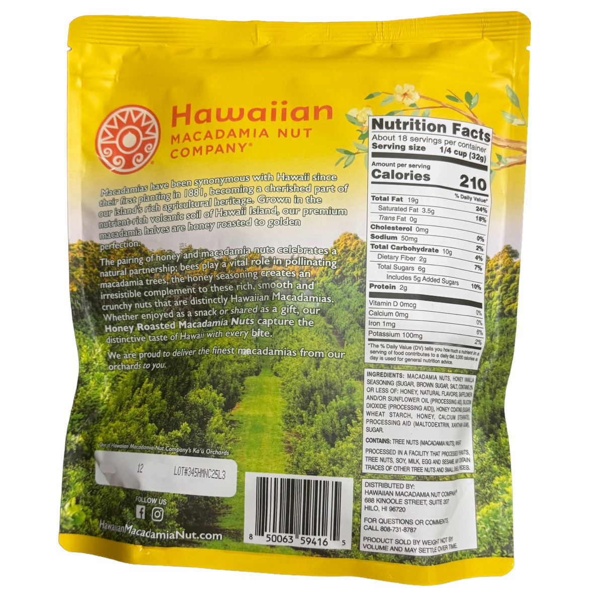 Experience the rich, buttery crunch of 100% Hawaii-grown macadamia nuts, dry roasted to golden perfection and coated in sweet honey. Grown in volcanic soil on Hawai?i Island, these premium macadamias celebrate a perfect pairing: smooth, crunchy nuts and golden honey.