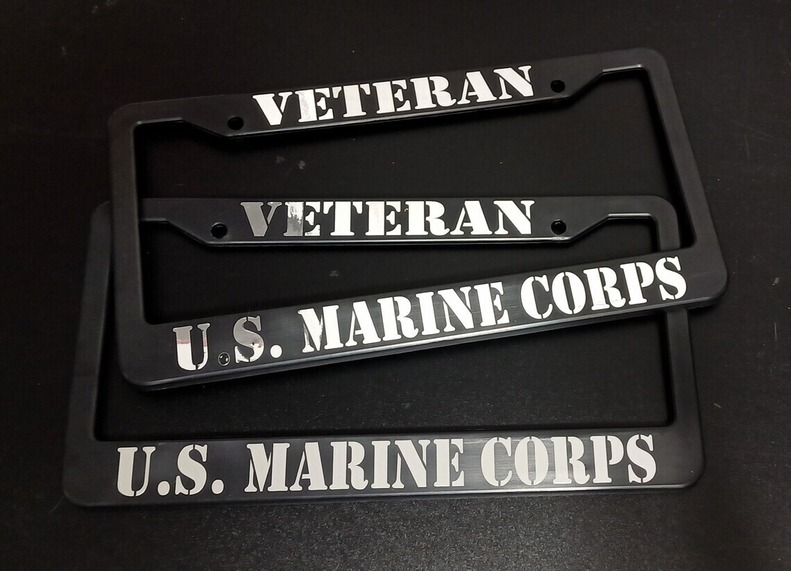 Set of 2 - U.S. Marine Corps Veteran Car License Plate Frames Black Plastic Auto