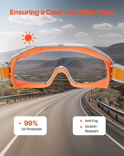 Comfortable to Wear: The adjustable headband allows a customized fit for different head sizes. Weighing only 0.161 lbs, the work goggles have ventilation ports to avoid stuffiness during long wear. The spacious interior design accommodates prescription glasses comfortably without causing pressure or tightness