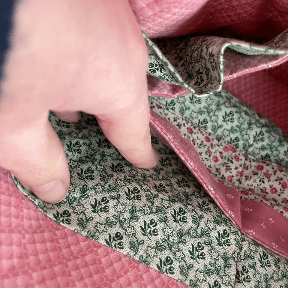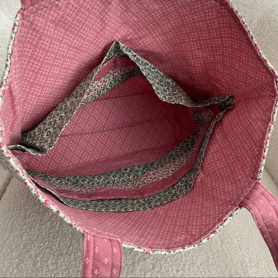 Calico floral print country cottage tote bag purse with pouch pockets inside that are blocked like quilt squares. Measures approx 10. 5? x 15? x 5? with a 9 inch strap drop
