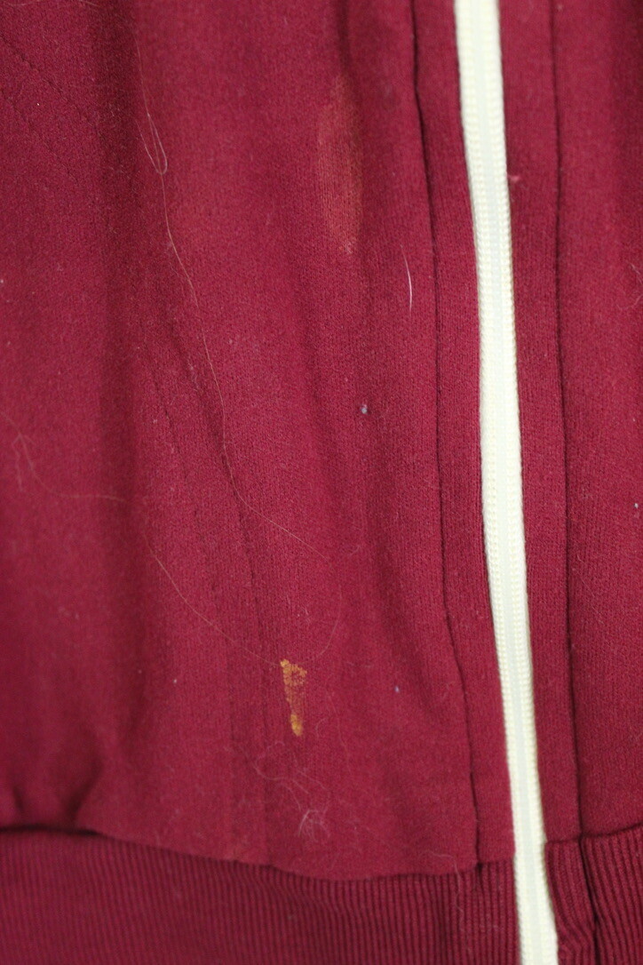 100% stretch nylon, maroon red with white striping, ribbed trim, zip front, TENeX label