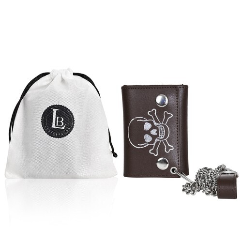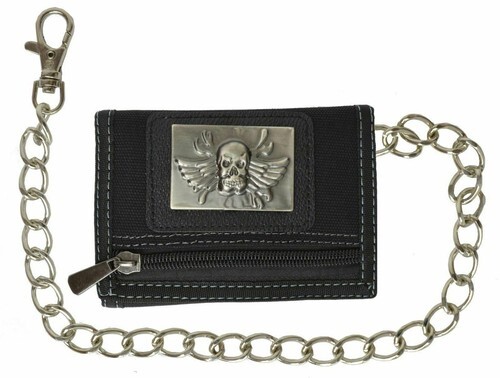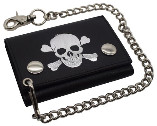 SKULL AND CROSS BONES ROSES TRIFOLD BIKER WALLET W CHAIN mens LEATHER #570 NEW