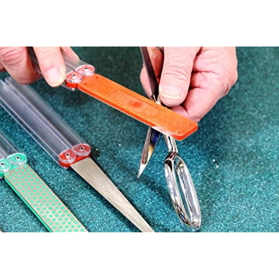 Product Description - From the Manufacturer Convenient, lightweight and portable 4" x 1" diamond dhetstone sharpener. Multi-use on scissors, knives, garden tools, and specialty tools, etc. Fine diamond (25 micron / 600 mesh) for a razor sharp edge. Convenient size: 9 1/2" open. 5" closed. Folding plastic handles protect sharpener when not in use. Sharpens in a fraction of the time required by conventional stones. No messy oils needed--sharpen dry or with water. Durable construction will provide years of consistent performance and reliable service For proper tool maintenance, woodworkers, chefs and other professionals rely on the superior quality and versatility of DMT products. Made in USA.