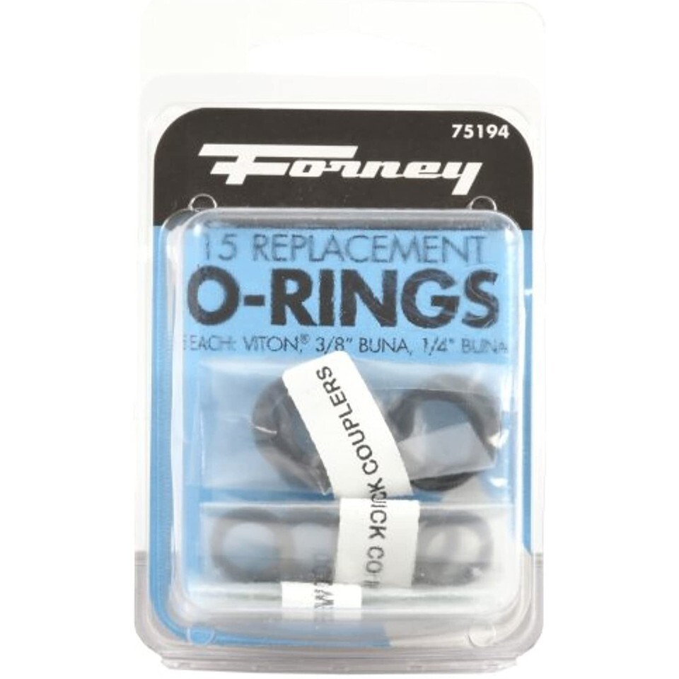 The Forney 75194 15-Piece Replacement O-Ring set includes five (5) each of the three (3) most common pressure washer replacement O-rings, Forney 75190, Viton compatible Screw Coupler O-Rings, 75191, 3/8" (9. 52mm) Buna compatible Quick Coupler O-Rings and 75192, 1/4" (6. 35mm) Buna compatible Quick Coupler O-Rings. These are used to replace worn O-rings of the Screw Couplers and Quick Couplers. Forney Industries is one of America's longest operating family-owned metal working product companies. Founded in 1932, Forney offers more than 5, 000 products for the hardware, automotive, farm and ranch and do-it-yourself markets. If you've got metal working questions, we've got answers. We're committed to your success regardless of location size or needs. Claims for must be made within 90 days of the date of purchase. Proof of purchase required. This does not cover any product that has been subject to misuse, neglect, negligence or accident, or that has been used in any way contrary to the purpose intended.